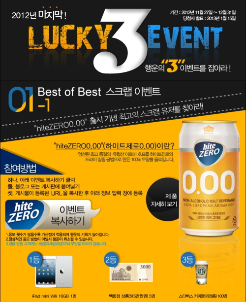 럭키3는 ▲하이트제로0.00 출시 ▲탄산수 ‘디아망’ 리뉴얼 ▲하이트진로 홈페이지 리뉴얼을 기념하는 이벤트다.