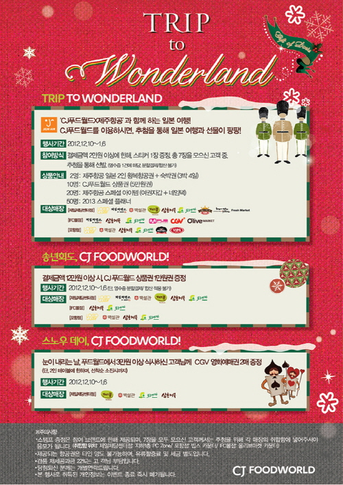또 같은 기간 동안 눈이 내리는 날에 CJ푸드월드 제일제당센터점 내 행복한 콩, 백설관, 프레시안 브라제리 삼호어묵 4개 매장에서 2인 고객이 3만원 이상 결제하면 CGV 영화예매권 2매를 증정한다.