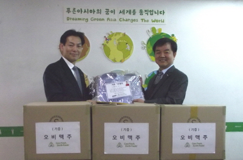 오비맥주 최수만 정책홍보 전무는 4일 서울 서대문구 충정로의 환경시민단체 푸른아시아를 방문해 오기출 사무총장에게 직원들이 기증한 의류 340여 벌을 전달했다.