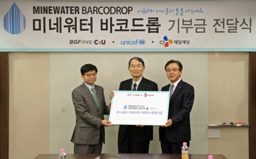 CJ제일제당과 BGF리테일은 최근 서울시 중구 쌍림동에 위치한 제일제당센터에서 CJ제일제당 정태영 부사장, BGF리테일 이용상 이사, 유니세프 한국위원회 송상현 회장 등이 참석한 가운데 미네워터 바코드롭 캠페인 기부금 전달식을 가졌다.
