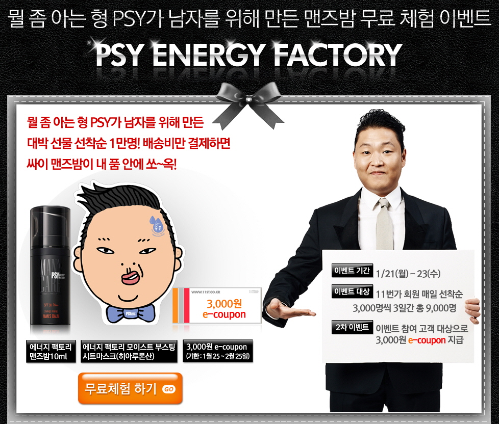 이번 행사 제품인 '꽃을든남자 에너지 팩토리'는 모델 싸이가 제품 기획단계부터 완성까지 참여한 프로젝트 브랜드다.