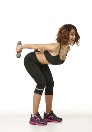 팔을 곧게 편 상태에서 덤벨을 몸 뒤로 최대한 들어 올려 바닥과 수평을 만든다. 이 때 어깨가 밑으로 쳐져서는 안 된다.