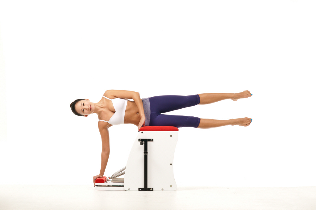 어깨 바로 아래 손이 위치할 수 있도록 체어 위에 옆으로 누워 손으로 페달을 누르고 머리부터 발끝까지 일직선을 유지한다.