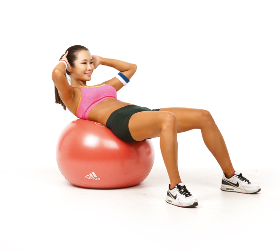 스태빌리티 볼에 앉은 뒤 발을 조금씩 앞으로 내딛어 등 위쪽이 공에 닿게 한다.