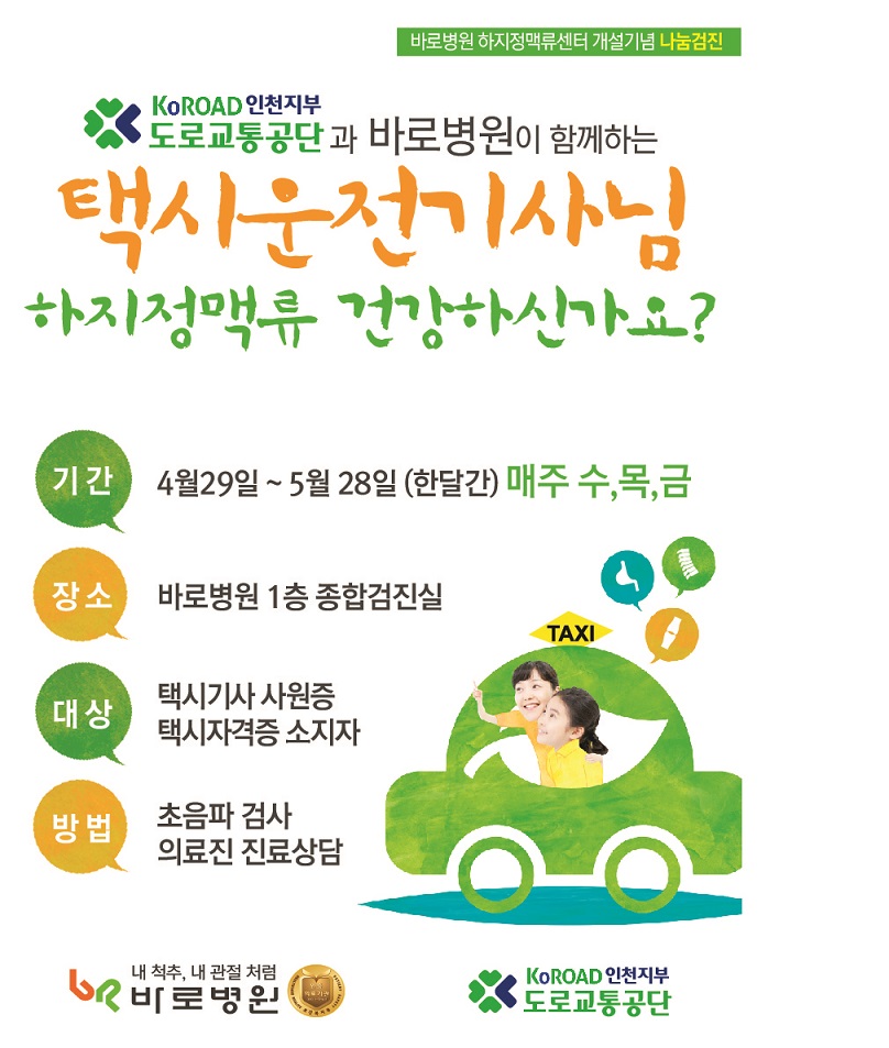 바로병원이 도로교통공단 인천지부와 함께 오는 28일까지 택시운전사 대상 하지정맥류 나눔 검진을 실시한다고 2일 밝혔다.