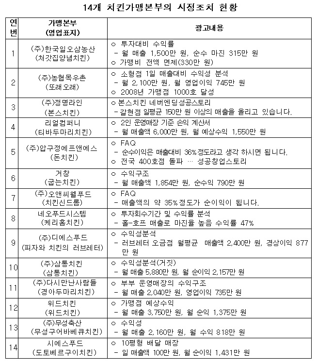 공정거래위원회는 치킨가맹점창업과 관련해 사실과 다르게 거짓ㆍ과장 광고한 14개 치킨가맹본부에 대해 시정조치를 내렸다고 15일 밝혔다.