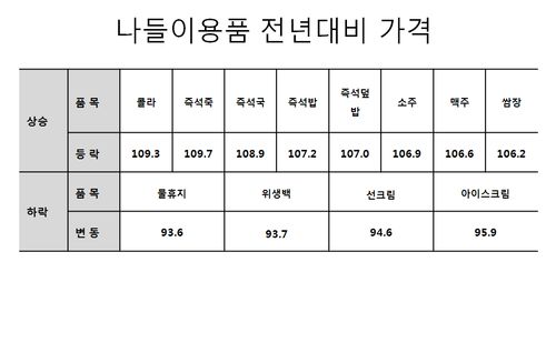 나들이용품의 7월 가격을 비교한 결과, 즉석식품과 주류 등의 가격은 다소 높아졌으며 물티슈, 위생백, 선크림 등은 가격이 낮아진 것으로 확인됐다.