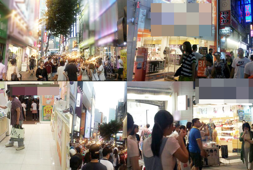 특히나 화장품 매장이 밀집된 구역에선 자동문의 전원을 차단하며 개방해 놓고 냉방기를 '빵빵' 틀어놓은 채 입구에서 손님 유치 경쟁을 펼치고 있었다.