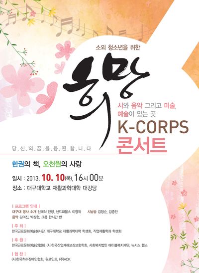 한국문화예술봉사단과 대구대학교 재활과학대학 학생회 및 직업재활학과 학생회가 공동 주최하는 이번 콘서트는 대구대학교 학생들이 자발적으로 책과 참가비를 모았다는 소식이 전해지며 훈훈함을 더하고 있다.