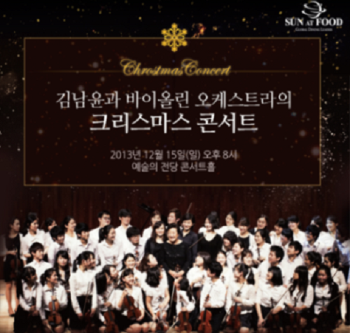 외식 기업 썬앳푸드는 자사 멤버십 고객 500명을 대상으로 오는 15일 오후 8시 예술의 전당 콘서트홀에서 열리는 '김남윤과 바이올린 오케스트라의 크리스마스 콘서트'를 후원한다고 11일 밝혔다.