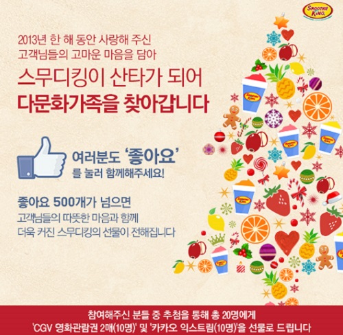 스무디킹 공식 페이스북에서 ‘좋아요’버튼을 누르면 이웃을 생각하는 따뜻한 마음이 적립돼 다문화가족들에게 선물이 전달되는 방식이다.