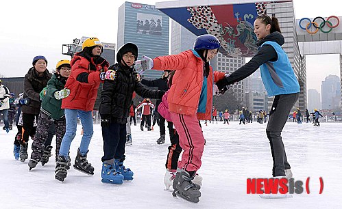 24일 오전 서울 송파구 방이동 올림픽공원 아이스링크에서 열린 국민체육공단 어린이 겨울스포츠 체험행사에서 피겨 유망주 최진주(오른쪽)가 어린이들과 함께 스케이트를 타며 즐거운 시간을 보내고 있다.