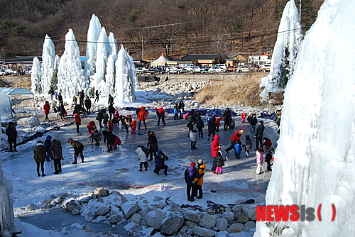 동장군축제조직위원회는 포천동장군축제가 열리는 오는 30일부터 다음달 1일까지 방문객들을 대상으로 설연휴 특별이벤트를 펼친다고 27일 밝혔다. 축제장에서 가족 단위 방문객들이 얼음판위에서 팽이치기를 하고 있다.