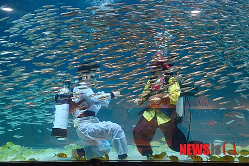 설 연휴가 시작된 30일 오후 서울 강남구 코엑스 아쿠아리움에서 열린 '정어리와 함께하는 2014 흥부와 놀부'에서 흥부와 놀부로 분한 다이버들이 공연을 선보이고 있다.이번 행사는 설 연휴기간인 2일까지 코엑스 아쿠아리움에서 열린다.