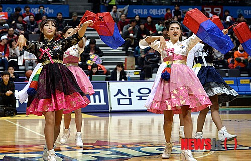 29일 오후 경기도 고양 실내체육관에서 열린 2013-2014 KB국민카드 남자 프로농구 고양 오리온스와 인천 전자랜드 엘리펀츠의 경기에 앞서 치어리더들이 한복을 입고 응원을 하고 있다.