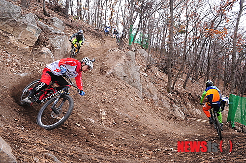 3일 전북 고창군은 고창읍 석정리에 국내 최대규모로 조성한 MTB파크에서 오는 29일과 30일 '고창군수배 전국 산악자전거대회'가 열린다고 밝혔다. 고창 MTB파크를 찾은 국가대표 및 동호회 회원들이 시범 라이딩을 펼치고 있는 모습. (사진 = 고창군 제공)