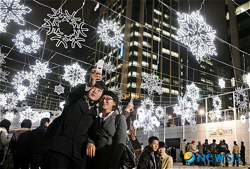 하이서울페스티벌 2008 겨울축제 점등식이 열린 19일 오후 서울 청계천에서 시민들이 눈꽃거리를 거닐며 즐거운 시간을 보내고 있다.'빛'을 주제로 한 하이서울페스티벌 겨울축제는 오늘 점등식을 시작으로 2009년 1월 18일까지 31일간 열린다.