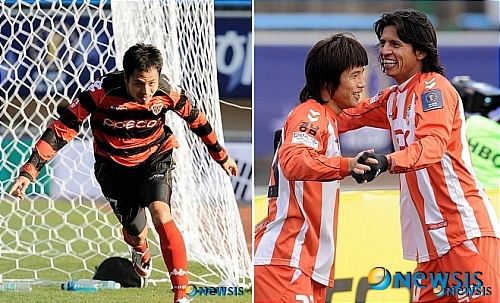 18일 제주종합운동장에서 열린 FA컵 4강전 대구FC전에서 후반전 백헤딩으로 팀의 두번째 골을 성공시킨 후 환호하고 있는 포항 스틸러스의 이광재(사진 왼쪽)와 고양 KB국민은행전에서 후반전 팀의 네번째 골과 함께 헤트트릭을 기록한 후 기뻐하고 있는 김동찬(경남FC.가운데)과 인디오.