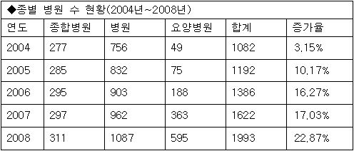 병원수는 2004년 756곳에서 2008년 1087곳으로 331곳(43.78%) 늘었다.