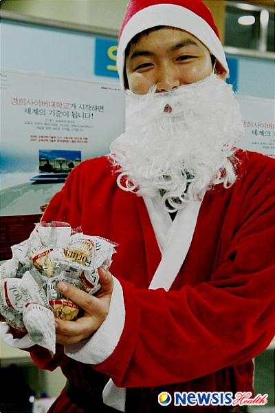 ▲ 경희사이버대학교가 지난 20일 경희대 서울캠퍼스 청운관에서 개최한 입학설명회에서 깜짝 등장한 산타가 행운의 쿠키를 나눠주며 함박 웃음을 짓고 있다. <사진=경희사이버대학교 제공> 조진성기자 jingls29@newsin.co.kr 【서울=뉴시스헬스】조진성 기자 = 경희사이버대학교가 지난 20일 경희대 서울캠퍼스 청운관에서 개최한 입학설명회에서 깜짝 등장한 산타가 행운의 쿠키를 나눠주며 함박 웃음을 짓고 있다. <사진=경희사이버대학교 제공>