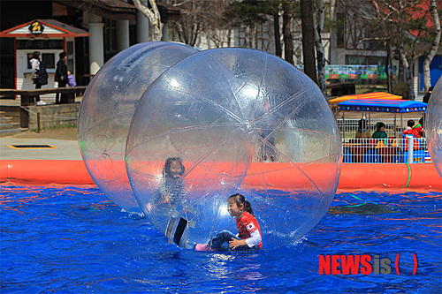 지난 24일 강원 평창 대관령 용평리조트에서 아이들이 '아쿠아 볼'을 타고 있다.계절이 여름으로 치달으면서 레저업체들도 앞다퉈 '여름 레저시설'을 선보이며 손님 몰이에 나서고 있다.