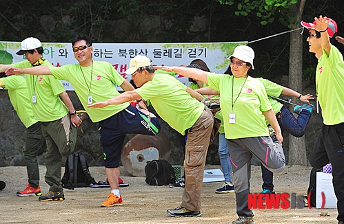 28일 오전 서울 도봉구 북한산 국립공원에서 열린 동국제약, '센시아와 함께하는 5월애(愛) 부부사랑 캠페인'에 참가한 중년 부부들이 둘레길 걷기에 앞서 몸풀기 체조를 하고 있다. (사진=동국제약 제공)