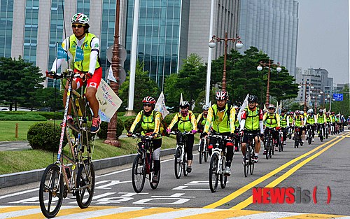 한국자전거단체협의회는 지난 8일 안전행정부, 국민대통합위원회, 안전문화중앙협의회 후원으로 전국 16개 광역시, 도시민을 대상으로 안전문화확산 전국캠페인을 실시했다.이날 서울 여의도 국회 헌정기념관 앞에서 시민자원봉사단원 60여명이 서울 출정식을 갖고 자전거 퍼레이드를 하고 있다.