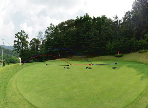 30m의 거리도 위와 동일한 방법으로 pw를 사용하는 것이다. pw는 클럽의 브랜드마다 약간의 차이는 있으나 보통 47° 48° 정도의 로프트 각으로 만들어져 있다. 위와 동일한 방법으로 시도한다면 더 낮은 탄도 많은 양의 런으로 거리를 컨트롤할 수 있다.