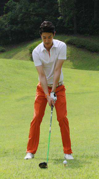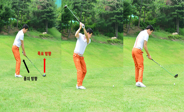 그런데 여기서 생기는 문제는 볼의 위치가 왼쪽에 있기 때문에 몸의 정렬이 틀어진다. 즉, 왼쪽 어깨나 골반이 너무 오픈되기가 쉽다. 또 목표가 왼쪽에 있어서 목표를 보면서 어드레스 하기 때문에 왼쪽 어깨나 골반이 오픈되는 경우가 많다.