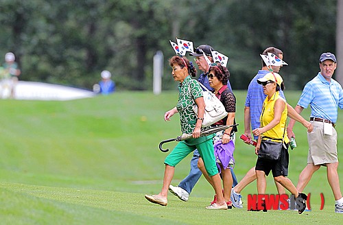 지난 24일(현지시각) 미국 동부 메릴랜드주 볼티모어에 위치한 캐이브스 밸리 골프코스에서 열린 인터내셔날크라운 1라운드 경기에서 현지 교민들이 한국대표팀 응원을 위해 머리에 태극기를 꽂고 이동하고 있다. (사진=하나금융그룹제공)