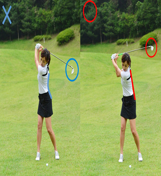 많은 아마추어들이 스윙을 하는데 어깨 회전을 어려워한다. 유연성이 부족하거나 근력이 부족하기 때문이다. 따라서 밑의 왼쪽 사진과 같이 팔로만 번쩍 드는 형태의 백스윙을 하면서 오버스윙을 초래하거나, 허리가 C자 형태로 휘게 된다.