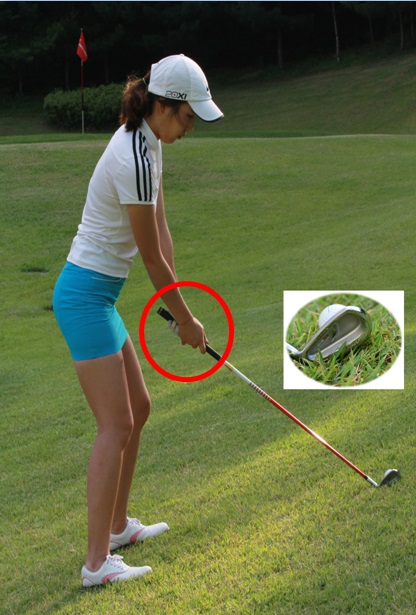 발끝 오르막 경사에서는 공과 스탠스가 가까워지기 때문에 위의 사진과 같이 클럽을 짧게 잡아주는 것이 좋다. 컨트롤하기 쉽게 하기 위해서인데 경사가 심할수록 더 짧게 잡아주어야 한다. 그렇기 때문에 클럽은 한두 클럽 긴 클럽을 선택하는 것이 원하는 거리를 보낼 수 있다.