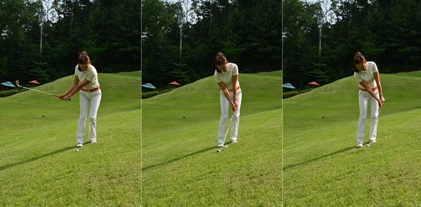스윙은 최대한 하체의 움직임을 고정시킨 상태에서 이루어져야 하며 이러한 경사면의 어프로치에서 가장 중요한 것은 임팩트 후의 모습이다. 사진1과 같은 느낌의 팔로우스루를 만들려고 하면 탑핑이 나는 미스샷이 나올 수 있으므로 팔로우스루를 생략하고 임팩트를 하는 것이다.