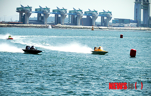 전남 목포시는 오는 13일부터 14일까지 평화광장 해상 특설경기장에서 '2014 생명의 땅 전남ㆍ목포국제파워보트대회'를 개최한다고 지난 5일 밝혔다. 영산강 방조제를 배경으로 파워보트 경기가 펼쳐지고 있는 모습. (사진=목포시 제공)