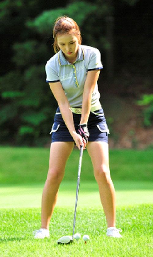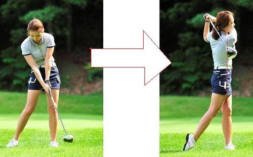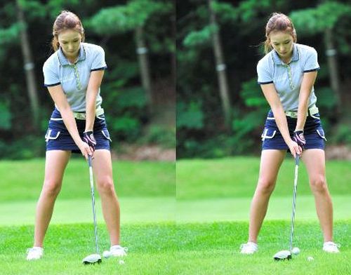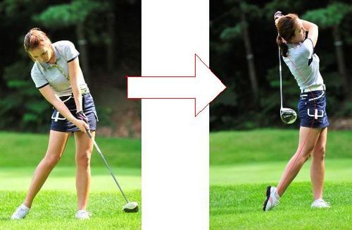 로우샷에서는 위의 사진과 같이 임팩트 시 허리가 들어가는 스윙을 하게 되면 공이 뜰 수 있다. 오히려 아래 사진처럼 오른쪽 허리가 왼쪽으로 덮어들어간다는 느낌으로 지면과 수평으로 돌아주는 것이 좋다. 머리가 너무 공 뒤쪽으로 남겨져 있지 않아도 된다. 따라서 피니시를 했을 때 역C자형(위 사진) 모습이 아닌 I자형(아래 사진)의 모습으로 나오는 것이 탄도를 낮출 수 있는 비결이다.