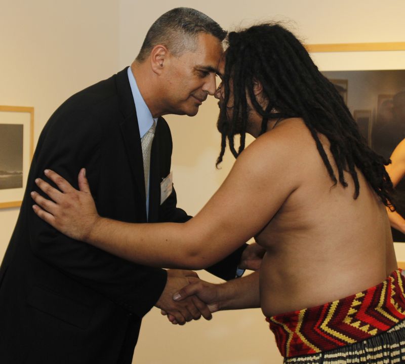 【서울=뉴시스헬스】이경호 기자 = 김종범 사진작가의 뉴질랜드 사진전 'View NZ' 개막식 행사가 16일 서울 종로구 갤러리 나우에서 펼쳐진 가운데, 패트릭 라타 주한 뉴질랜드 대사(왼쪽)가 공연단원과 생명을 의미하는 뉴질랜드 마오리족의 전통 인사법을 나누고 있다.lkh@newsin.co.kr