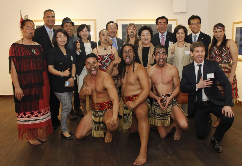 【서울=뉴시스헬스】이경호 기자 = 김종범 사진작가의 뉴질랜드 사진전 'View NZ' 개막식 행사가 16일 서울 종로구 갤러리 나우에서 펼쳐진 가운데, 마오리족 공연단원들과 개막식에 참석한 인사들이 익살스런 포즈를 취하고 있다.lkh@newsin.co.kr