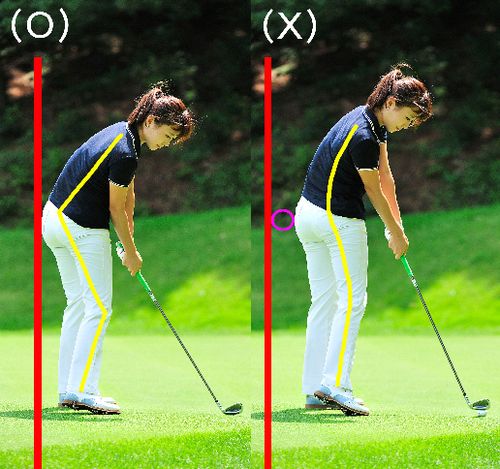 왼쪽 사진은 올바른 모습이고 오른쪽 사진은 임팩트에서 몸이 펴지는(얼리 익스텐션) 모습인데, 골퍼들에게 흔히 일어나는 스윙 오류 중 하나다. 오른쪽 사진과 같이 다운스윙 시 몸이 일찍 펴지게 되면 팔이 회전하는데 막히는 느낌을 받게 되고 당겨 치게 된다. 또한 훅 볼을 유발하기도 하고 심한 경우 생크 샷이 나기도 한다.