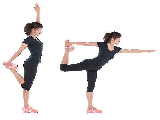 4. 발목을 잡고 있지 않은 손을 앞으로 쭉 펴고 균형을 잡는다.