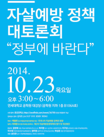 생명공동체운동을 전개하는 비영리 민간단체 자살예방 행동포럼 라이프(LIFE, 대표 이명수 박일준 송인한)가 주최하는 '정부에 바란다, 자살예방 정책 대토론회'가 오는 23일 연세대학교 공학원 대강당(공학원 지하 1층 B106A호)에서 열린다.