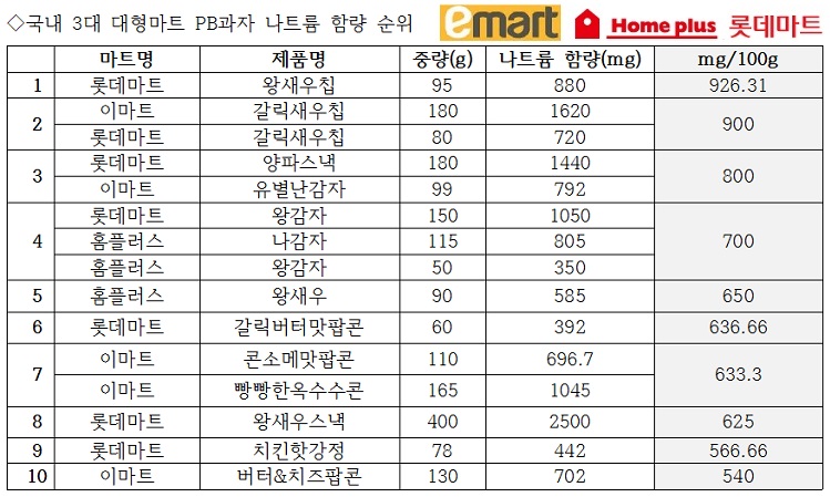 총 31개의 PB과자를 선보이고 있는 롯데마트의 경우 ▲왕새우칩 926.31㎎ ▲갈릭새우칩 900㎎ ▲양파스낵 800㎎ ▲오징어스낵 716.66㎎ ▲왕감자 700㎎ ▲갈릭버터맛팝콘 636.66㎎ ▲왕새우스낵 625㎎ ▲치킨핫강정 566.66㎎ ▲버터&콘소메팝콘 538.46㎎ ▲카라멜&플레인팝콘 474.66㎎ 순으로 나트륨 함량이 많다.