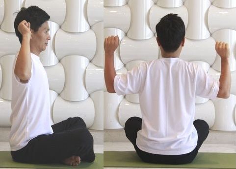 1. 서거나 앉은 자세에서 양 팔을 구부리고 옆으로 벌려 가슴을 펴준다.