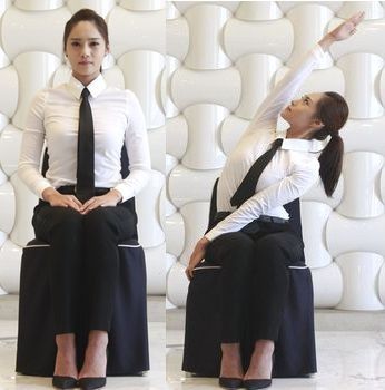 1. 척추를 바르게 펴고 앉은 상태에서 한 손은 반대 팔걸이를 잡고 다른 한손은 머리 위로 길게 뻗어 올린다.