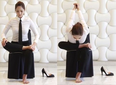 1. 들어 올렸던 발을 반대 다리 무릎 위에 내려놓고 양손을 등 뒤에서 깍지 낀다.