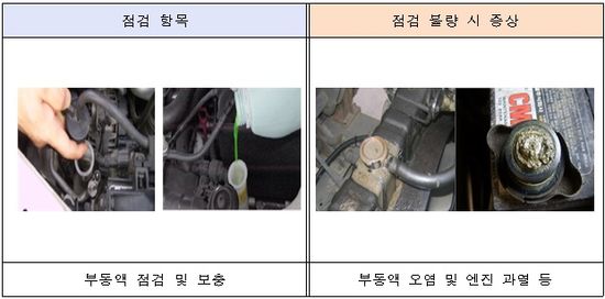 부동액(냉각수)은 물과의 비율을 50:50비율로 희석해 사용하고, 부동액의 상태(농도, 녹물 발생여부 등)와 양을 점검해 교환한지 2년(4만km)이 넘었다면 교환하는 것이 좋으며 냉각팬 고장을 대비해 휴즈ㆍ전선 등도 미리 점검하는 것이 좋다.