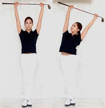 2. 두 팔을 머리 위로 멀리 뻗어 골프채를 밀어 올려 준다.