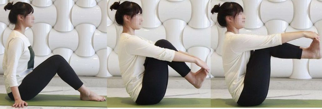 2. 양손으로 발끝을 잡고 숨을 마시며 복부의 힘으로 천천히 다리를 들어올린다.