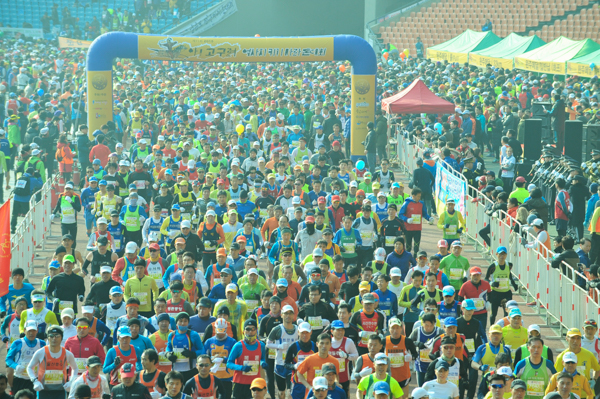 파란 하늘을 가로지르듯 출발을 알리는 공기총이 발포되자 1만2000여 명의 마라톤 동호인들이 진지한 표정으로 자신의 시계를 보며 초를 재기 시작한다. 서울경찰악대(악대장 하만진)는 신나는 북소리와 함께 아리랑을 행진곡으로 편곡해 마라톤 주자들의 출발을 응원했다.