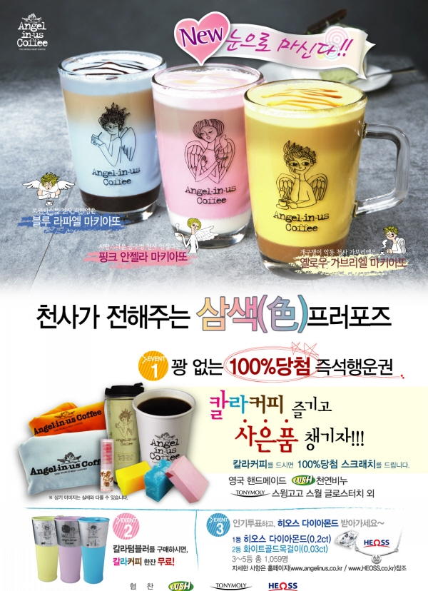 컬러커피 3종은 엔제리너스커피의 천사 캐릭터 이미지를 컬러로 표현했다.