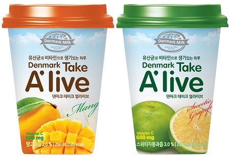 덴마크 테이크 얼라이브는 각각 이스라엘산 스위티자몽과 망고 과즙을 함유한 국내 최초 컵 타입 유산균 음료다.